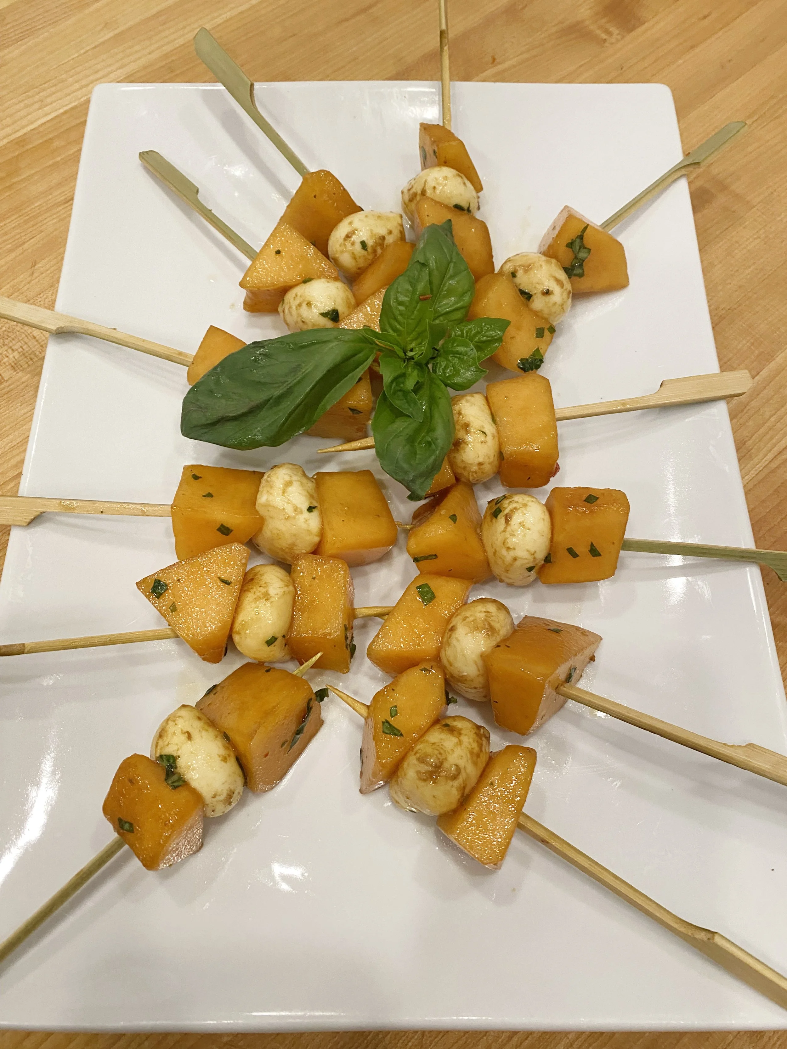 Just before serving, assemble the skewers. Start and end each skewer with a piece of cantaloupe, placing the cheese in between. Plate for serving, leaving any liquid in the bowl, and garnish with a sprig of basil.