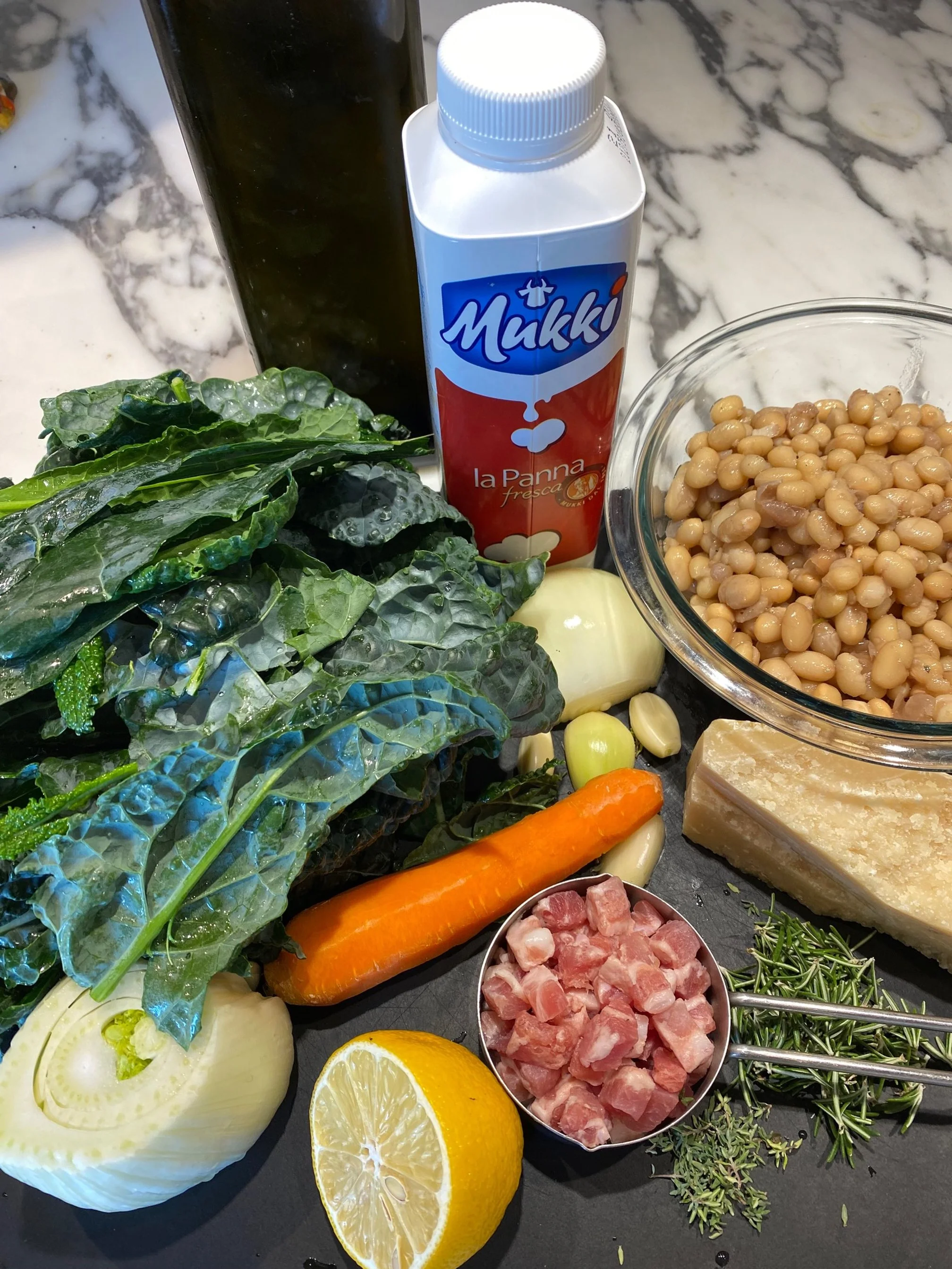 Preheat oven to 375° an hour before serving. In a large skillet over medium temperature, toss pancetta (or bacon) with olive oil and cook until brown. Remove with a slotted spoon and set aside. Lower heat slightly and add diced fennel to the oil with a pinch of salt and grating of pepper. Toss and stir for 15 minutes. Do not allow it to brown very much.