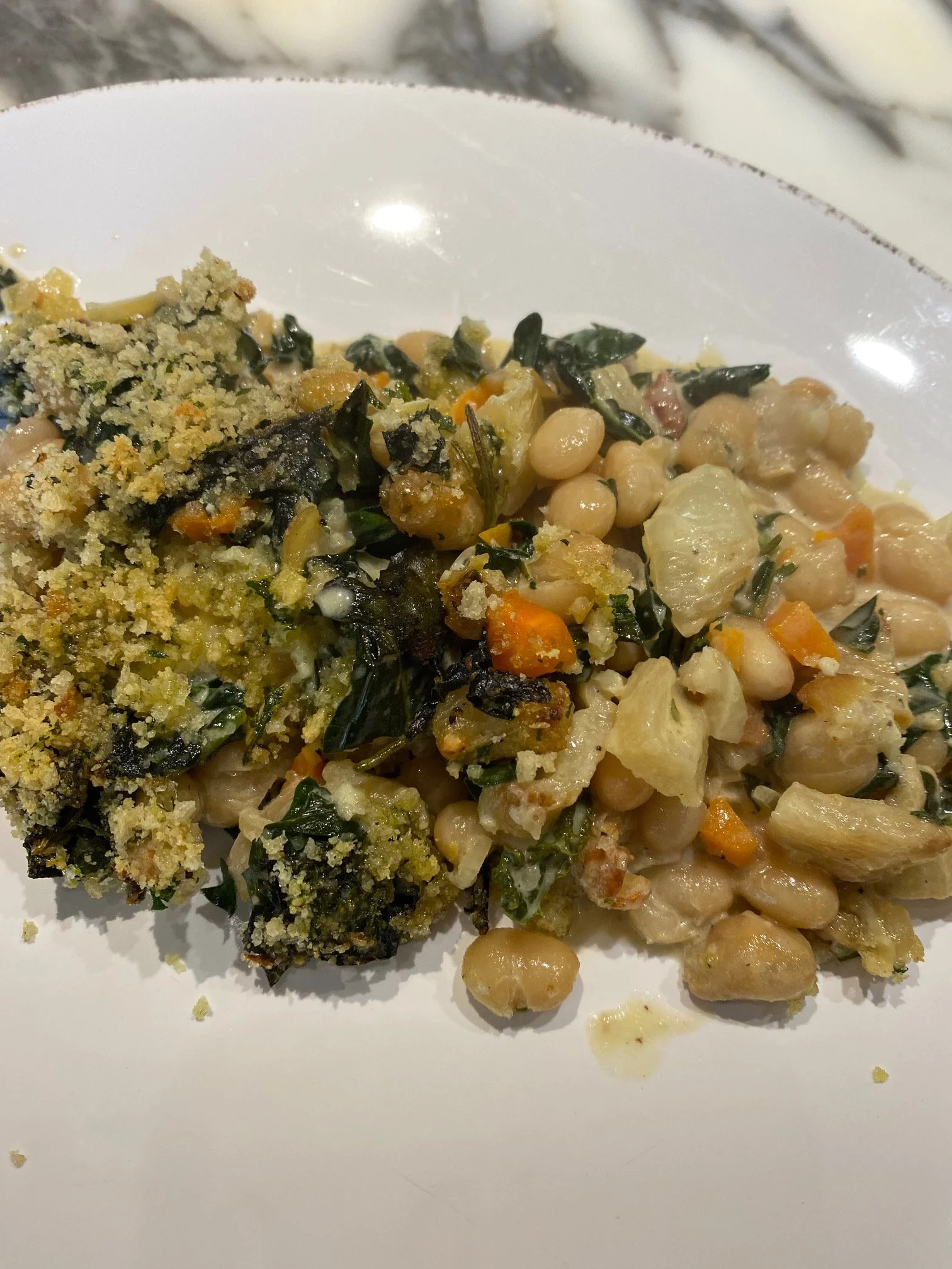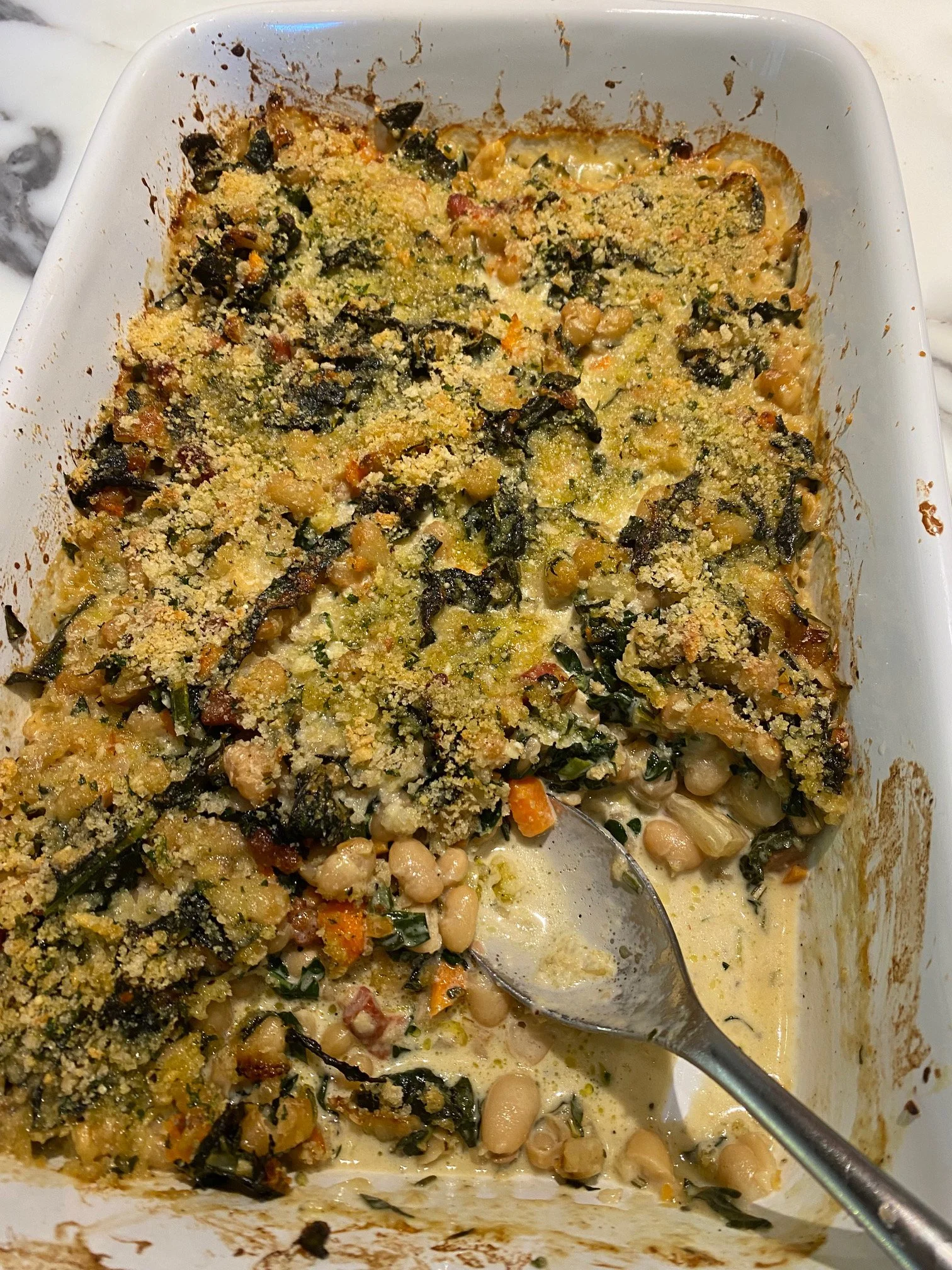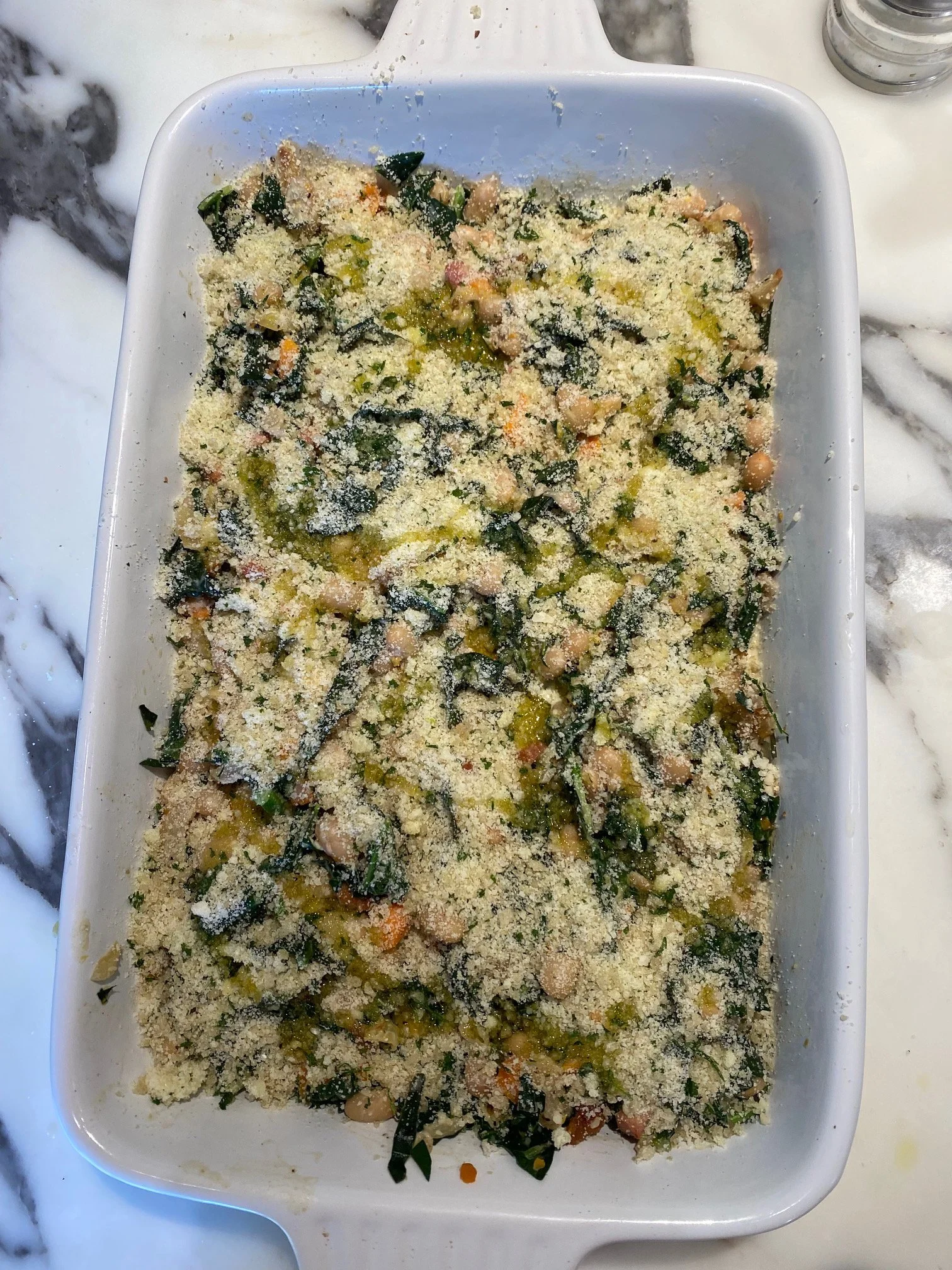 Off the heat, add the beans, Parmesan, and cream. Taste again for salt and pepper. Pour into a rectangular casserole dish. (At this point, the dish can be held at room temperature for up to four hours without baking. Add the topping just before baking.)