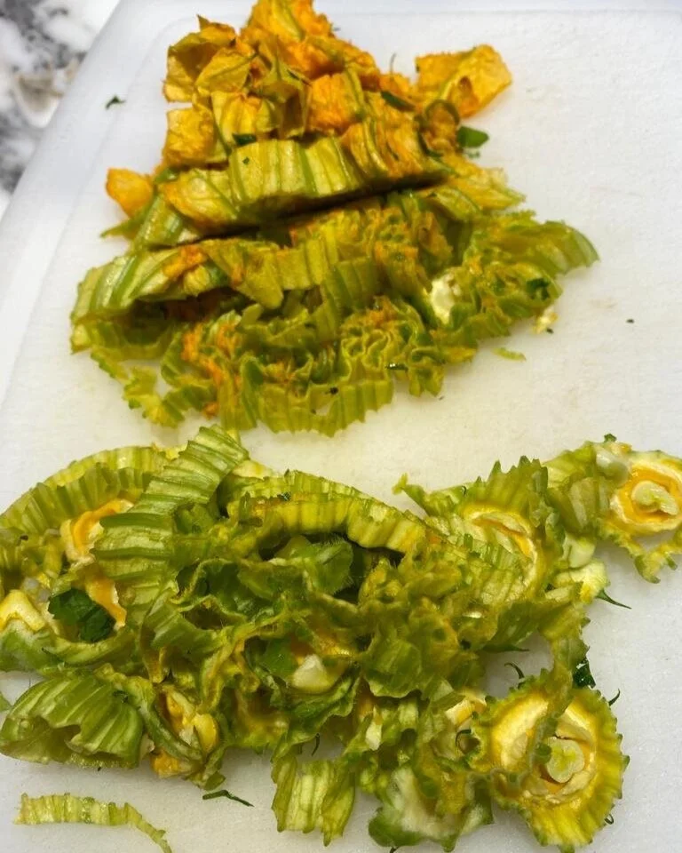 After removing the stems and pistils (the inner nubs) from the squash blossoms, chop them, separating the thicker stem portion from the petals.